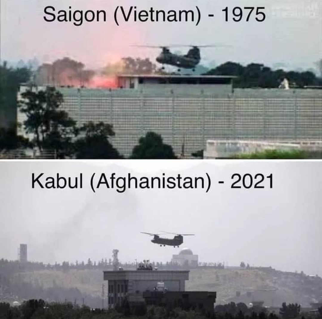 For those who don’t understand the meaning of this piece’s title: in the US military, helicopters are frequently referred to as “birds”. The attached photos include a bird that had been used to evacuate US diplomats from Vietnam, loyally serving again decades later to evacuate US personnel from Afghanistan. Now, it will be left like so much detritus – to be forgotten and consumed by the sands of time in a place no one will remember. And so will the warriors who rode them and never came home. Sure, their families and brothers in arms will remember. But the electorate who sent them there will continue on their merry way, ignorant to the past, present, and without a doubt, the future.